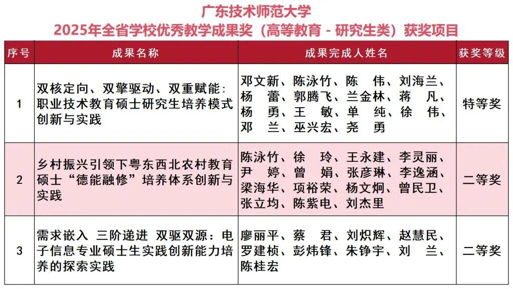 雨燕直播,NBA直播,世界杯直播,足球直播,台球直播,体育直播,世界杯,欧洲杯,苏超直播,村BA直播,苏超联赛,村超,村超直播近日,《广东省人力资源和社会保障厅广东省教育厅关于表彰全省学校(高等教育)优秀教学成果奖的决定》(粤人社发〔2025〕47号)正式公布2025年全省学校优秀教学成果奖(高等教育-研究生类)获奖项目。我校研究生教学成果奖实现历史性突破,荣获3项省级奖,包括特等奖1项、二等奖2项,获奖等级与获奖率均位居省属同类高校前列。尤其值得关注的是,本次评选仅产生10项特等奖,其中我校是唯一一所非博士授予高校,这凸显了我校在研究生教育教学改革中的优势特色和育人成效。